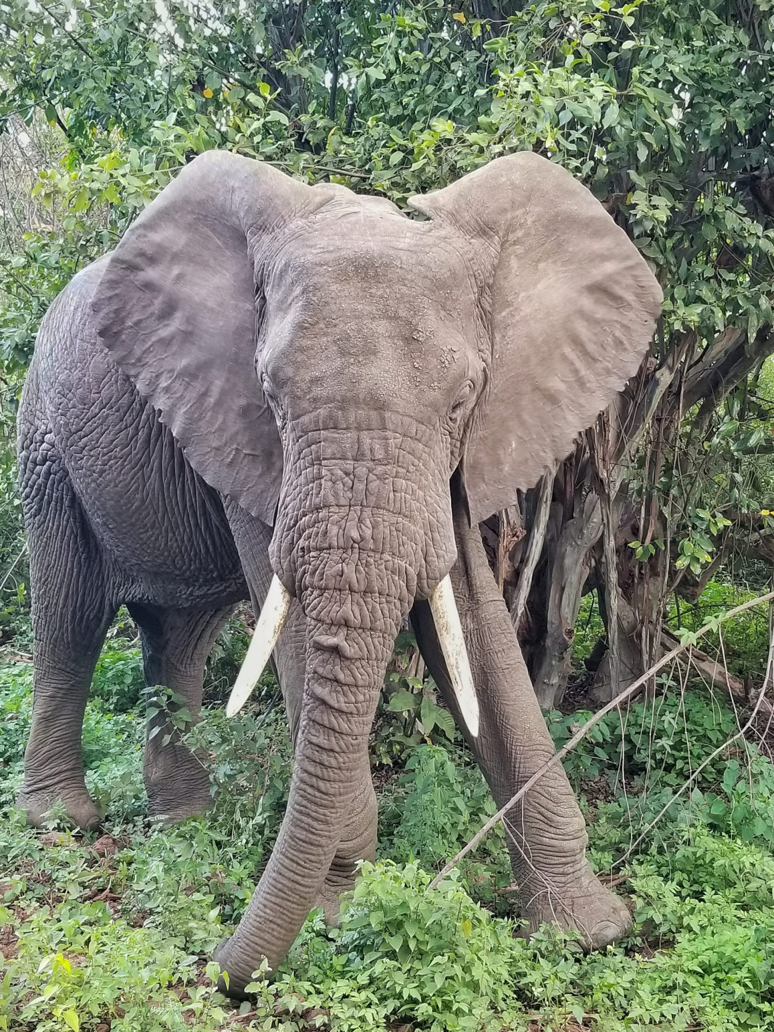 My favorite elephant sightings on my Kenya + Tanzania safari were here. Our safari vehicle was 360-degree surrounded by two separate elephant family herds. Oooh, the babies! Our safari guide, Titus heard two bull elephants begin to trumpet in the distance. He said, “I think these bulls are preparing to fight for the opportunity to mate.” Our elephant show was then quickly over as the herds headed into the dense forest- perhaps to cheer on their favorite bull.